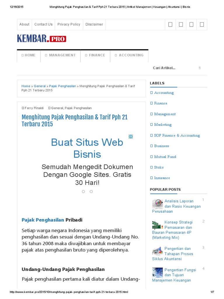 Menghitung Pajak Penghasilan & Tarif Pph 21 Terbaru 2015